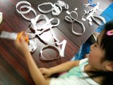 「メビウスの輪」ご存じですよね。ちょっとねじってつないだだけの輪ですが、ペンで中心にずう〜っと線を引いていくとなんだか不思議な気分になります。その線をハサミで切ってみても、また不思議、こどもたちの予想を裏切るカタチの輪ができました。「あれ?」「ん?」「なんで?」「そうや!ねじり方かえてみよっ!」らぴすっこたちの創造力は「メビウスの輪」よりも果てしないのでした。