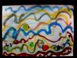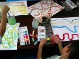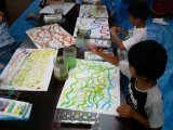 「どんぶらこ〜どんぶらこ〜」とリズミカルに筆を運んで波線を描きます。「ふ〜〜ん。これってたぶん楽しいなあ〜〜」と微妙な感想を漏らしていたのはこころくん。ちょっとゆったりしたひとときでした。