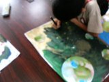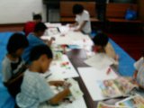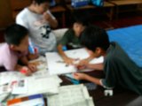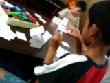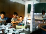 名刺大の画用紙をたくさん用意しました・・・いえいえ、実は去年額縁を作ったときの端切れです(^_^)V「さて、このペタンコの画用紙をできるだけ高いものにしてください。長いものじゃなくて高いものです。使う道具はハサミだけ。」みんな立てかけてみたり、重ねてみたり・・・「無理やあ〜」「こんなんすぐ倒れる〜」「セロテープあったら楽勝やのにい〜」でも、しばらくすると・・・「わかったあ!切り込みを合体させたらええんや!」「下を頑丈にしたらいけるっ!」「折ってみてもいけるで!」と、それぞれ工夫して高い高い塔を作ってくれました。