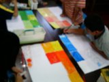 さて、マスキングテープを貼り終わったら、今度はローラーで好きな色の絵の具を塗ります。少し乾いてから剥がす・・・これが快感!!「うわあっ!真っ白がでてきたあっ!」「きれいやなあ」ってあちこちから声があがりました。