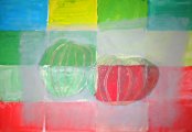 この時期あちこちで見かけるカボチャです。今年は猛暑の影響か(?)スイカっぽくなるこが多かったです(^_^;)「ほらほら、よ〜く見てね。まんまるじゃないし、スイカみたいにつるつるでもないよ〜」大きいこは鉛筆で、小さいこはクレパスで描きました。