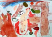 こちらははじめくんの作品。葉っぱのある風景です。樹木の枝ぶりの描き方に工夫があって、とても楽しい!よ〜く見ると貼付けた葉っぱには葉脈も描かれています。