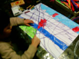 「画用紙の端から端まで、ゆっくりしっかりていねいな線をたくさん引いてみよう。端から端までちゃんと届いていれば、まっすぐでも曲がっていてもいいよ。」さてさて、交差したたくさんの線の中から偶然みつかったものは???