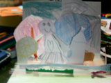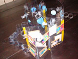 一昨年、デュシャンの「大ガラス」をヒントに、3枚のアクリル板(デュシャンは2枚の大きなガラスでしたが)をコイルで立てて、そこに絵の具や色画用紙などを自由に組み合わせた作品に取り組みました。画像が手元に残っていないので紹介できないのですが、あるらぴすっこのお母さんから「昼間の自然光を受けた時、夜、部屋の灯りをつけた時、その時その時の光の具合で微妙に変化することに驚きました・・・・・」という感動のお手紙をいただいたことが印象に残っています。こんなふうにこどものひとつの作品からいろいろ感じてもらえると、とてもとてもと〜〜っても嬉しいです{/ハート/}