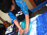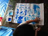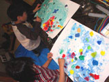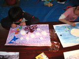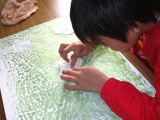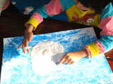 フィンガーペインティングです。「海の色の絵の具だしてね〜」と声をかけると、みんな思い思いの絵の具をだして洗濯のりと混ぜ合わせ、ビニールシートの上にたら〜りたら〜り。「気持ちいい〜!」「あれ〜?変な色になった〜」