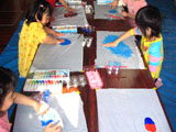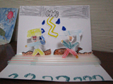 さて、フィンガーペインティングしたものを画用紙に写し取ってから海と島が登場するおはなしをしました。紙粘土・色画用紙・クレパス・・・などを使って、自分のイメージを表現していきます。