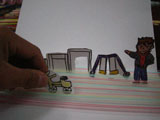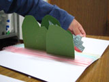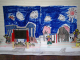 ストローを10数本ぴったり並べて画用紙に貼って、小さな画用紙に描いた絵を切り抜いて立てています。ストローの間に立てているだけなので、前後に移動したり、左右に滑らせたり、簡単にできます。こんな遊びから空間の表現を楽しんでもらいました。