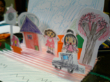 うららちゃんとななみちゃんの作品です。このクラスは少人数なので、わたしも座って「こんにちは」とか「いらっしゃい」とかおままごとのような会話をしながら、あっという間の1時間半でした。実はわたしも小さい頃は人形やままごとセットを母がくれた古いトランクに詰めて、友達の家に遊びに行ったものです。広島の街を彷徨う(あ、わたし広島出身です)家出少女みたいですね(^_^;)