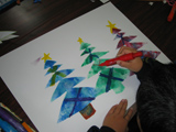 クリスマス特集第三弾です。画用紙でツリー型を作って、ローラーでステンシルしました。「ツリー色2色以上だしてね〜」と声をかけ、みんなそれぞれのツリー色でコロコロコロ・・・出来上がり画像はのちほど。