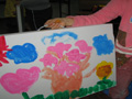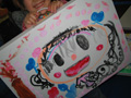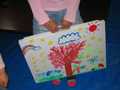 いつもは額縁風にしていたのですが、今年の水曜クラスは、真っ白な作品収納バッグにそのまま絵の具で自由に絵を描きました。みんな戸惑うことなくおもいっきりやってくれました♪