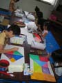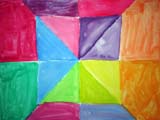画用紙をテキトーに数回折ります。でも折り目はすきっときっちり。「折り目で区切って全部違う色で塗ってね〜」と言うと、小さなこは自分の絵の具の数を数えて「え〜っ!?えのぐ足れへん〜」「混ぜてごらん。い〜〜っぱい数えきれないぐらい色ができるよ。」