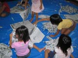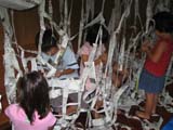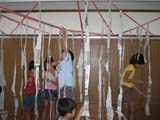 水曜クラスでは新聞を細く裂いて天井から吊り下げ、どんどん繋いでいきました。「雨ふってるみたいや〜」「うわっ!出られへんようになった!」などと大騒ぎ。新聞でつくったお化けもなんだか笑顔でした。