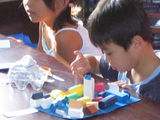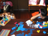 ちょこっと工作のつもりが・・・じっくり工作になってしまうことがよくあります。紙を折らずに端と端をつなぐと円型、それを一回折ると雫型、二回でかまぼこ型、三回、四回、五回・・・って感じで、いろんなカタチの立体を作って組み合わせる簡単工作。2時間以上使って、(本人によると)未完成が数名・・・。ま、思う存分やってください♪