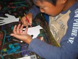手形を切り抜くと・・・いろんなところを折ることができます。いや、もちろん「手」なんでお約束事はあります。折れるのは関節のところ・・・あれっ{/!?/}{/!?/}中にはわたしにはできない関節の動きを見せてくれたこもいますが・・・{/汗/}