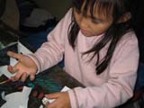 手の形をとって切り抜いた2枚重ねの画用紙、よ〜〜くよ〜〜く自分の手を観察しながら皺や爪を描いていきます。最近のこどもたちはネイルアートもお手の物。みんなワイワイ言いながら楽しそうでした。