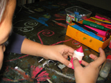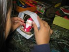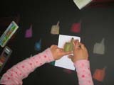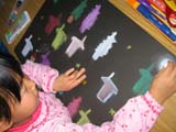 コンテを使ったステンシルです{/ハート/}「型」のまんなかあたりにコンテを塗って、あとは指でゴシゴシ広げていきます。「この音きら〜〜いっ」ってこもいましたが、色を混ぜてみたり、思いついたものを描いたりして、ふわふわの世界を楽しみました。