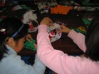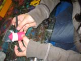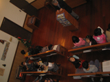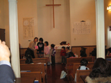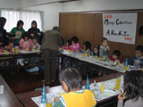 キリスト教会なので本物の牧師さんも登場。ちょっとローテンションな{/目/}サンタさんもやってきました。ミニ工作では、ゆらめくローソク風のライトと紙でツリー形のランプシェードを作りました。後半はお父さんお母さんも参加してくれて、にぎやかに過ごしました。座るところがなくなっちゃってごめんなさいm(_ _)m