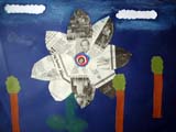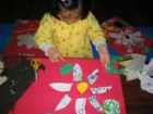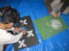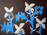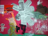 ちょっとこの辺では見ないような花を描いてほしくて、資料としてジャングルの花を紹介しました。新聞や色画用紙、絵の具で遊んだ画用紙などのコラージュです。