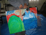 こちらは2月からキャンバスにアクリル絵の具で「古いお城」を描いていたひなちゃん(小5)とゆめちゃん(小5)の作品です。せっかくなので、木片や粘土で自由に額縁を作りました。「古いお城」になんと斬新な額{/!!/}