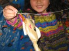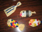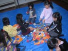 水曜クラスのみんなには、今までさんざん使い込んだ色画用紙片をさらに細かくちぎってもらいました。輪になって作業していると、新しく入ったこたちも和やかな良い雰囲気・・・それを封筒に詰め込んで、いろんな魚が生まれてきました。「あ、餌つくろっ」「餌入れもいるな」「釣り竿にくるくる回すとこつけたいな」と、イメージが広がったようです。