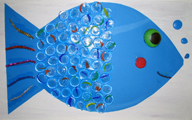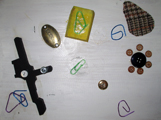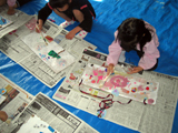 テーマは今回は自由。風景や何かであってもいいし、わけのわからないものでもカッコ良ければOKです。それぞれボタンや貝殻、ビーズなど、いろんなものを持って来て、白く塗った段ボール板にレイアウト。他のこが持っているものが欲しくなって、「なあなあ、ちょうだい、ちょっとちょうだい〜、なあなあなあ〜」なんてことも・・・「こらこらっ!しつこく言っちゃだめっ!ほら、困ってるでしょ!」と、注意する一幕もありながら進んでいきます。