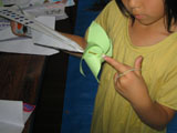 なんと!またしても写真を撮り損なってしまいました!この風車付き飛行機は、先日研究会で某先生(あ、栗山先生ですが・・・)に教えてもらった工作です。飛ばすと風車が回ってカサカサ・・・と心地よい音がします。みんなでワイワイ飛ばしまくって、「さあ!」と次のテーマに取りかかったときに「あ、写真!」・・・慌ててポーズをとってもらいました。ま、飛んでるところはこのカメラでは元々うまく撮れませんが・・・