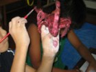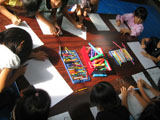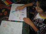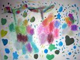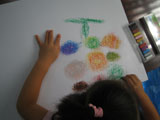 ずいぶん前にちらっとお話しましたが「幼児には混色をさせない」という先生もいます。だから先生が予め色を作っておくそうです。それにはそれなりの理由がいろいろあるようですが、そのひとつに、「混ぜる行為ばかりに執着するこがいる」というのがありました。確かにそんなこともあります。いきなり全部の色をぐちゃぐちゃっと混ぜてしまって、できた色はいつも同じような色がひとつだけ。これでは見栄えのいい配色になるまで相当な時間が必要、との判断でしょうか。でもその「混ぜる行為」をとりあげてしまっていいのでしょうか。指定した色を指定の場所に・・・こどもたちは先生という画家のアシスタントではありません。