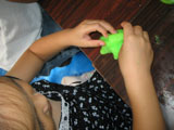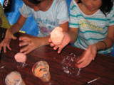「スライム〜」「スライムいつぅ〜?」・・・どこからともなく聞こえてきます。幻聴???いえ、そうではありませんでした。らぴすっこは何年通っても、スライム大好き。で、今年もリクエストにお応えしてスライムです。今回はひと味加えて(ほんとにある調味料を加えました。あ、食べるわけではありませんよ{/パー/})、スーパーボールタイプも作ってみました。スーパーボールっぽく弾ませて遊ぶことができます。