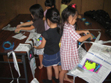 半分に切った古新聞を一枚ずつ渡しました。「さて、この新聞を自分よりも背の高いものにしてください。使っていいのはハサミだけ。」「えっセロテープあかんの?」「だめです。」「立ってなくてもいい?」「それはいいです。」みんなそれぞれ工夫して、なが〜いものを作ってくれました。「エッフェル塔」という声もありました。もちろんそれも正解{/チョキ/}