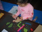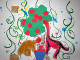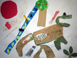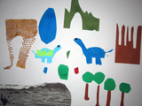 またでた!コラージュです♪今回のテーマは恐竜。恐竜図鑑を参考にしながら、これまでにいろいろ遊んだ画用紙を使っての制作です。