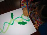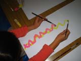 節分に因んで「ジャックと豆の木」のおはなし(関係ないか)をさらっとしました。なぜ「さらっと」かと言うと、両手を使ってぐんぐん伸びる線を描いたあとの展開はそれぞれにおまかせ。おはなしと関係なくなっても構わなかったからです。画用紙がいつもより長いので、みんな立ち上がって、ぐ〜〜んと腕を伸ばして元気いっぱい描いてくれました。