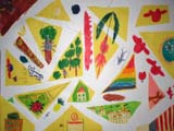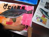 左がとってもカラフルなのぞみちゃん(小2)、右がほのぼの泳ぐあすかちゃん(小3)の作品です。「よ〜く見てね〜。この魚は海で泳いでる生きた魚じゃなくて、魚屋さんやスーパーで並んでる魚だよ〜。」みんなよ〜くよ〜く見て・・・しばらくすると「この色で描かなあかん?」「ここの線も描くの?」「ん?よ〜く見て、よ〜く見て、それで思った通りに描いてみてね。」で、みんな熱心に描きはじめました・・・なんと!?お魚さんたち、甦っちゃったのねっ♪