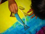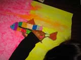絵の具に塩をかけました。かなり細かくて画像ではわかりにくいのですが、星砂の様な模様ができています。塩の効果が見えやすい色、見えにくい色があるのですが、「ま、いろいろ試してみてね」ってことで自由にやってもらいました。みんな絵の具まみれ塩まみれになりながら、妙に盛り上がった1時間半でした♪