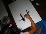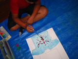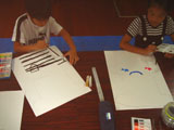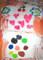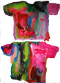 こちらは、左が10色ほどの絵の具を駆使して見事な配色、あおいちゃん(4才)、右が黙々と(おっ?突然静かになった?)時間をかけて丁寧に描いた模様、みとちゃん(5才)の作品。上が前身頃、下が後ろ身頃です。う〜〜ん着てみたい〜♪