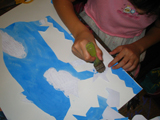 「空と雲」の画用紙を使ったコラージュです。7月もワヤワヤしているうちに時間切れ。完成は8月・・・かな?