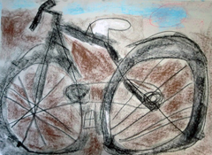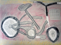 デッサンの雰囲気で、自転車は白黒のコンテで描きました。左がどんな凸凹道でもぐいぐい走りそうなともやくん(小1)、右がきちんと安全運転してくれそうなあすかちゃん(小3)の自転車です{/嬉しい/}