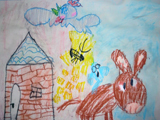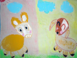 さて、導入の際に絵本は見せませんでした。知っている人も多いおはなしだし、わたしの十八番のおはなしでもあるので、素語りです。左がロバと犬が出会ったところを描いたゆりちゃん(小3)、右が泥棒を驚かそうと4匹が家に近付いているところを描いたさきちゃん(5才)の作品です。他にも泥棒側から見た4匹の影を描いたり、その家がいかに素敵な家だったかを描いたり、泥棒がもう逃げ出して4匹でパーティーをしているところを描いたり。みんなの絵を合わせれば、ひとつの紙芝居になりそうですねっ♪