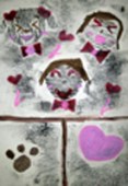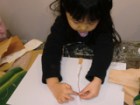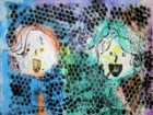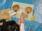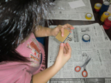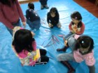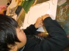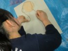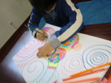 左から、ななこちゃん(6才)りおちゃん(小5)たくまくん(小2)あやのちゃん(小2)の作品です。段ボールや紐や布、いろんな素材を貼って版を作るコラグラフですが、「後で真黒に塗って版画だよ〜」と最初に言っても、作っているうちにいつの間にかみんな配色も結構考えていたりして、黒いインクで塗りつぶしてしまうのが惜しいような・・・・・・ん〜・・・でもここは心を鬼にして!あ〜つらい{/汗/}