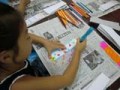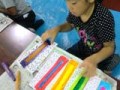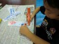 七夕はとっくに過ぎたのですが、短冊状の紙を用意しました。みんな願い事を書いているのではなく・・・いえ、いい言葉を書いていたひともいましたが(ちょっと感動してしまったわたし)・・・そうそう、計算式を書いていたひとも・・・やはり形状から思いついたんでしょうね。わたしは「一枚一枚色を塗ったり模様を描いたりしてみてね〜」と言っただけだったのですが・・・♪