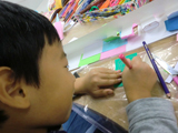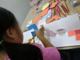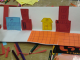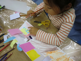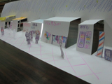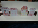 さて、今回は商店街をつくりました。導入に絵本「大阪うまいもんのうた」長谷川義史作を紹介して、「♪大阪にはうまいもんがいっぱいあるんやでぇ♪」と歌いつつ、ポップアップカードの要領で作り始めました。歌は次第に「商店街へ〜行〜こうよ♪商店街へ〜行〜こうよ♪」と、わたし得意のええ加減な歌になり、それに呼応するように、こどもたちも「ボンドくっださぁ〜い♪ボンドくっださぁ〜い♪」(木工用接着剤を容器に少量ずつ出し、追加しながら使用していました。)と歌い始め、外のひとが聞いたら「なんの教室???」って雰囲気で過ごしたのであります。「これ繋いだら天神橋筋商店街になる!」と言ったのは、ともやくん。で、みんなのを向かい合わせに置いて繋いで・・・「おぉ〜〜〜〜っ」と感動。感動のあまり、写真撮り忘れてしまいました・・・