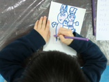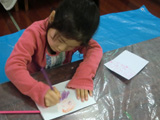 「今日はクレパス減っちゃうよ〜〜〜」と前置きして始めました。「あ”〜〜〜、黒がこんなに小さくなったぁ〜〜」と、ひきわり納豆ぐらいになった黒いクレパスを見せてくれたのは6年生のななみちゃん。うんうん、黒くんもきっと喜んでいることでしょう{/揺れるハート/}