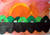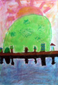 左からとってもきれいな色彩のののかちゃん(小1)、長時間脇目も振らずに描き続け、「まだおわりちゃうで」と、パワフルなりゅうせいくん(6才)、ほっこり優しい田舎の風景、たくまくん(小3)の作品です。