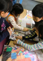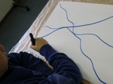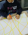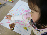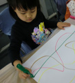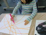 1月は行く・・・2月は逃げる・・・3月は去る・・・あ〜〜!なんでもう3月なのぉ〜〜〜!?おっと・・・取り乱してしまいました♪こんなときはコラージュで癒されましょう。雑誌や広告の切り抜きなんかも使うので、「そんな既成のもの使うなんて・・・」と眉をひそめる方々もいらっしゃいますが・・・現代美術ではもうずいぶん昔から市民権を得ている感じで、やってみると、描くことにまだ抵抗のあるひとも、もうみんな夢中です。芸大生顔負けの作品を生み出すらぴすっこもた〜っくさん。今回は白い画用紙にまずは自由にゆったり線を描くことから始めました。ここからもう個性が出てきます。きっちり線を揃えないと気が済まなかったり、テンションが上がって嵐のようになったり・・・。で、貼付ける素材選びにももちろん個性があふれます。