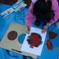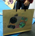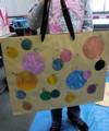 いろんな大きさの○型ステンシルをいろんな色でいろんなところに。ほほぉ〜、みんな♪なかなかいい色出すねぇ♪淡いのやら渋いのやら、お洒落なバッグで「またねぇ〜♪」