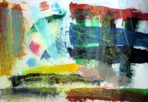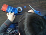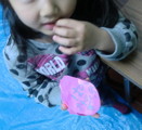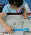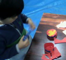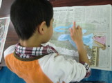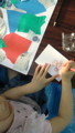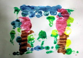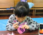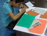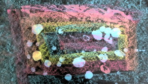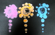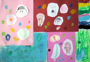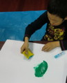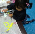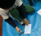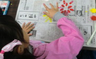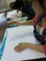 自分でつくったとろとろ絵の具を使って透明シートに直接指で描きます。「うわっ・・・きもちわるっ」と言っていたひとも、だんだん夢中になってくるのがこのフィンガーペインティング。散々遊んで自分で「よし」と思ったところで、画用紙に写し取ります。思った通りに写し取れたり、ぐちょっとなったり、びよ〜んとなったり、思い通りにならなかったり、思った以上にきれいになったり・・・結果はいろいろ。でもその結果は一面に過ぎないことをこどもたちは知っています。だからどんなふうになってもがっかりしない。今、自分の目の前に見えているものだけがそのすべてではないのです。