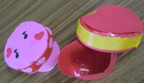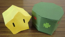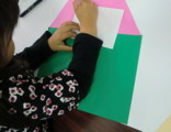 パッケージデザインです。○やら◇やら△やら、いろんなかたちのプレゼントの箱を画用紙1枚で作って、あとはいろんな飾り付け。どんなものをいれるのかな?誰にあげるのかな?
