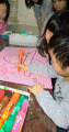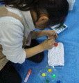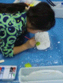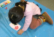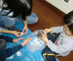 固まるまでじ〜〜っと見ているひと、絵を描くひと、貝殻を擦り合わせて音を楽しむひと。溶いた容器にはり付いていた石膏のかけらをパキパキ割るひと・・・これ、わたしも大好きです。容器なんかについた石膏とか木工用接着剤とか、排水管が詰まったりもするので、慌てて水道で洗い流しちゃいけません。しばらく放置しておくと、と〜〜っても楽しくきれいにパラリと剥がれます。