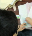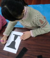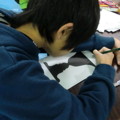 ”有名なあれ”というのは「ルビンの杯」です。「この絵になにかしてみて」と説明なしでみんなに渡しました。黒で描かれた方を主役「図」と見たひとがほとんどでした。白い部分、背景「地」に気づいたときのみんなの目がとってもキラキラしていて、写真に撮れなかったのが残念。その後自分で考えて描くのはかなり難しかったようですが、今回のテーマは気づくことが一番っ♪みんな満点の表情でした♪