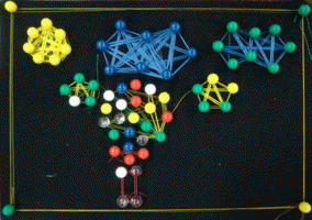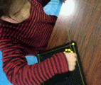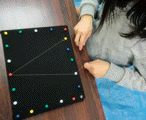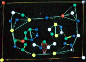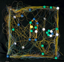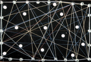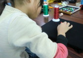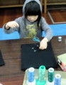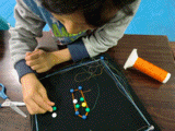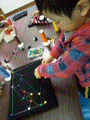 色つきの画鋲が黒地に映えるし、ぷすぷす簡単に刺さるし・・・まあ〜みんな楽しそう。今回は糸が主役なので、そんなにたくさん画鋲は用意していませんでした。「気持ちはわかる{/!/}気持ちはわかるんだけど主役は糸だ。糸どんどん使ってね〜」と繰り返し・・・で、画鋲もずいぶん使いましたが糸もちゃんとしっかり使ってくれました。いつもながら小さな画像でわかりにくいですが、とても細〜〜い糸を何重にも重ねています。