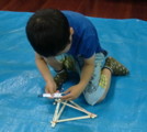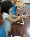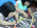 月曜クラスでは、わたしの見当違いもあって、すったもんだした発射台&発泡トレーロケット。(やはり材料のチェックは入念にしておかないと、エライ目に合います。人任せにしちゃいかんのだ・・・ぶつぶつぶつぶつ・・・)今日はすんなり出来上がって、た〜〜っぷり遊べました。4才から小6まで、一緒になってワイワイキャーキャーうるさいうるさい(いや、わたしも「いけ〜〜っ!!」だの「うおぉぉ〜〜!!」だの、結構騒いでました)。形や構えの角度、タイミングでいろんな飛び方をします。飛ばないこともあれば、空中分解ってこともあり。それでもめげないで試行錯誤するのが大事。素晴らしい飛びを見せたのが、意外にもハート形ロケット。「家でもいっぱいつくろ〜」って言いながら、みんな帰って行きました。発泡トレー、たいていのお家にありますもんね。